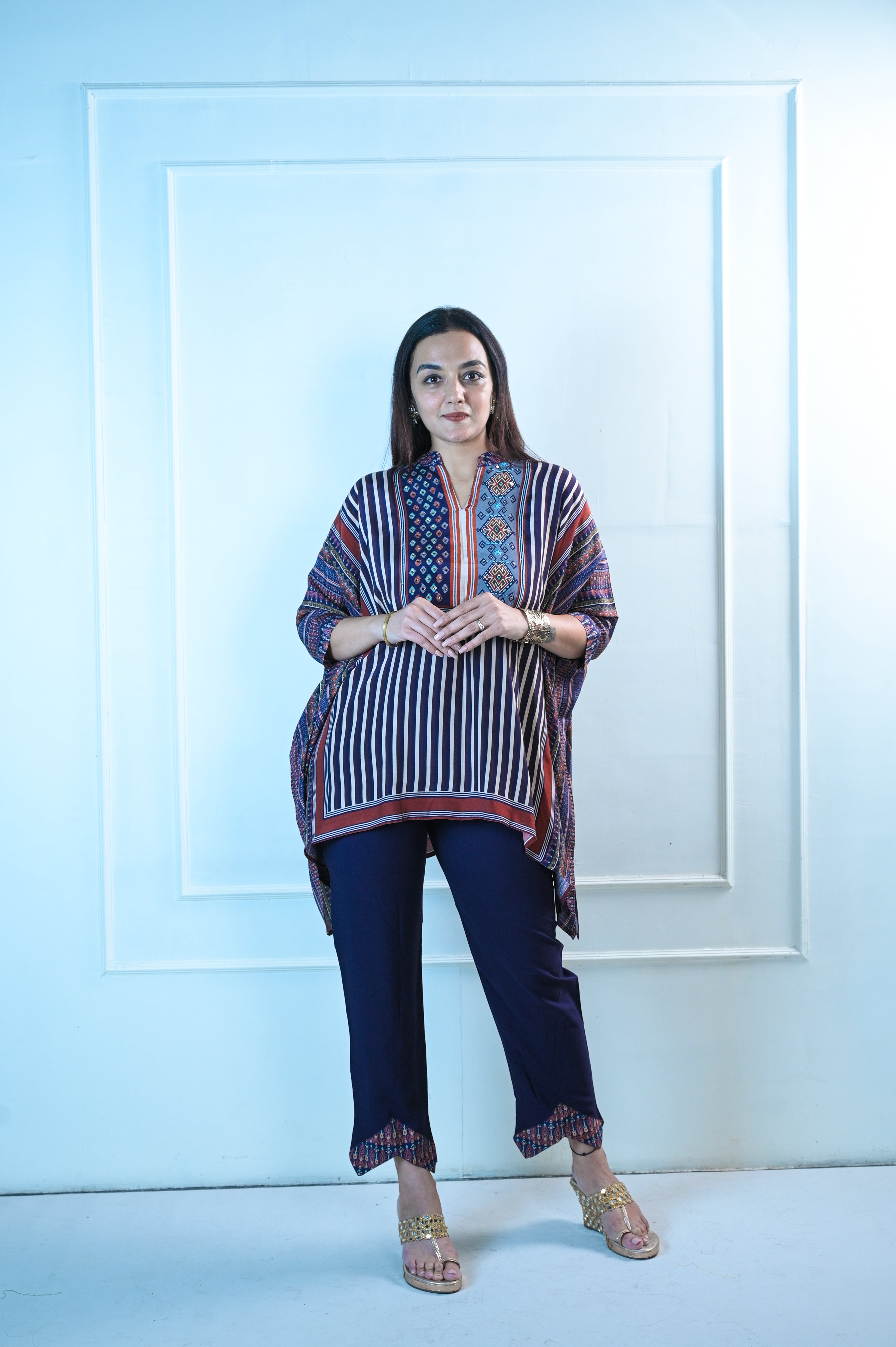Experience the charm of fusion fashion with our Indigo Mosaic Kaftan set. Crafted in rich navy tones with a medley of stripes and ethnic-inspired motifs, this free-flowing kaftan top brings effortless elegance with its relaxed silhouette and mirror and thread embroidery detailing. Paired with tapered bottoms featuring matching printed cuffs, this set is the perfect blend of comfort and style — ideal for brunches, travel days or festive gatherings.