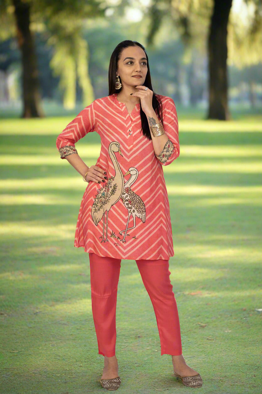 This chic pink coord set is the perfect blend of comfort and style. Featuring a flowy kurta adorned with a delicate swan print and subtle stone work, it exudes an elegant charm that’s ideal for both office and casual wear. The straight pant comes with attached liner ensuring maximum comfort and breathability, making it the perfect choice for those warm summer days. Whether you are heading to work or a relaxed outing, this versatile set keeps you looking effortlessly put together all day long.